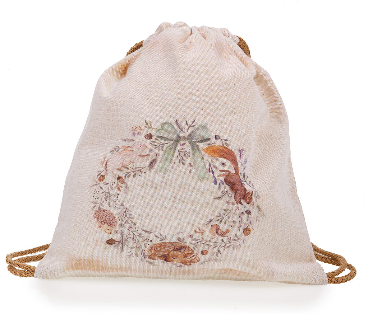 Βαμβακερό σακίδιο πλάτης με τυπωμένα τα ζωάκια του δάσους,δεμένο με 5 κουφέτα σοκολάτα.