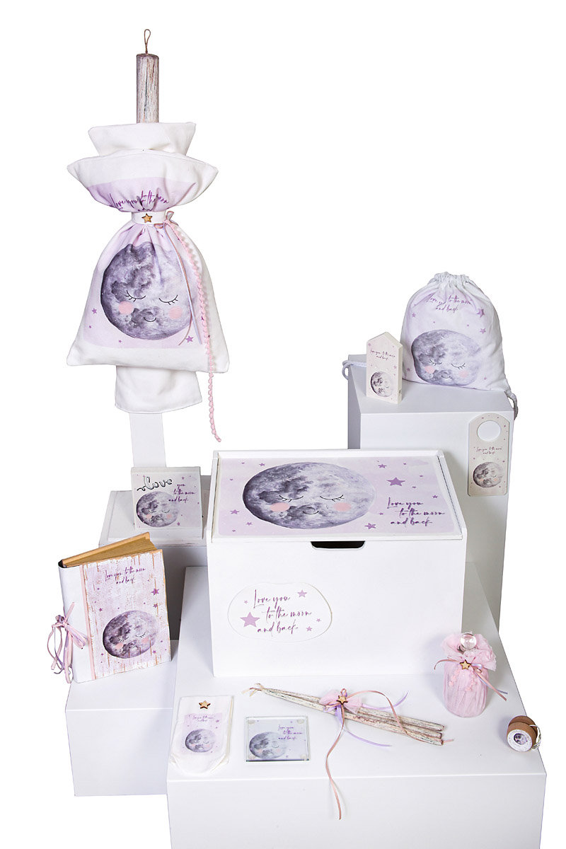 Βαπτιστικό σετ κουμπάρου με ζωγραφιστό κουτί,λαμπάδα με μαξιλαροθήκη τυπωμένη και λαδοσέτ με θέμα το φεγγαράκι.
