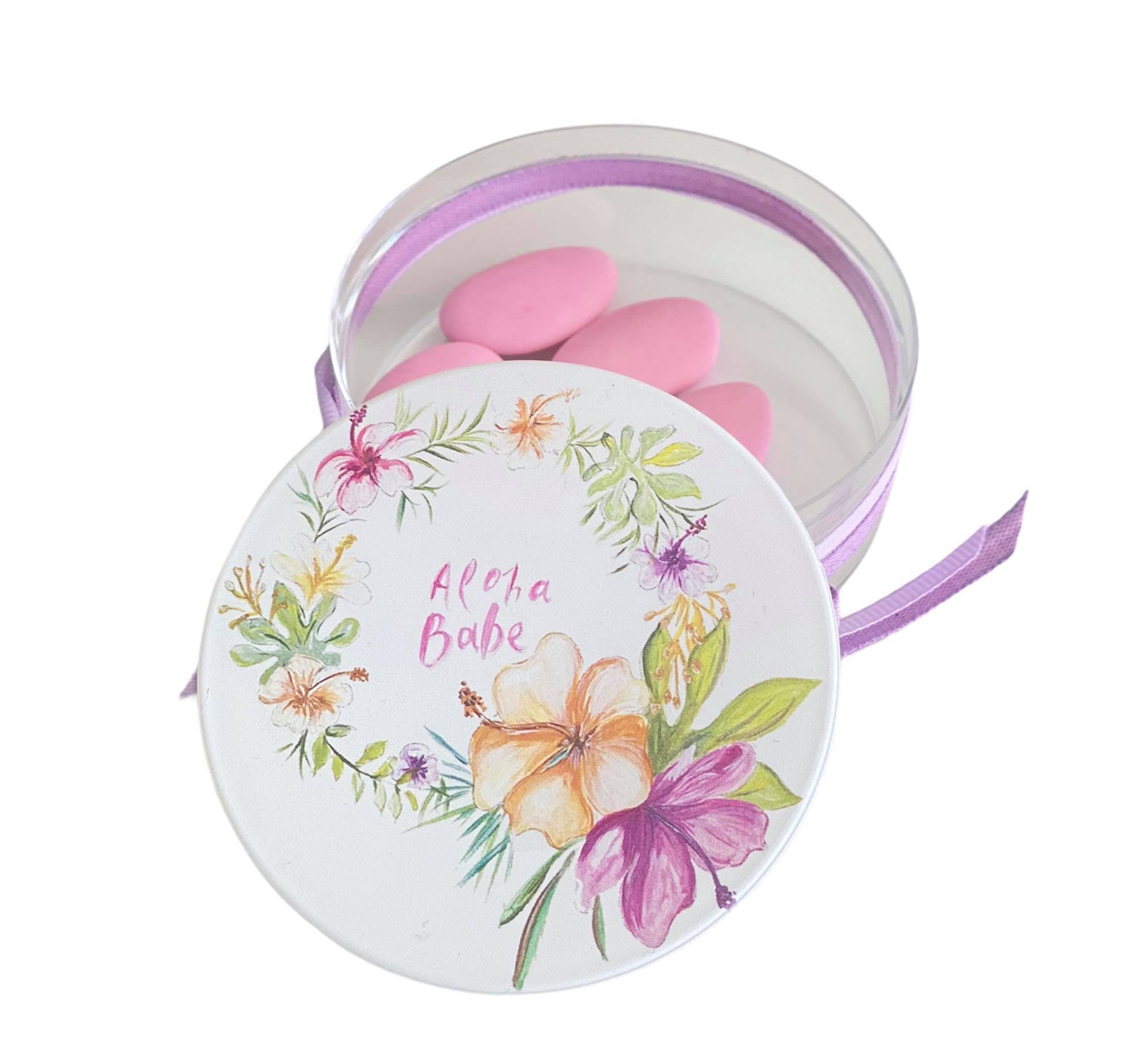Μπομπονιέρα κουτάκι πλέξιγκλας με τύπωμα υβίσκο και γεμισμένο με 5 κουφέτα σοκολάτας.
