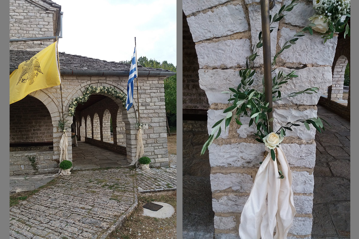 Hanging bouquets, olive branches and a white flower garland decorated the church,while at the reception a symphony of green gave us a simple yet beautiful scenery.
